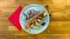 Közben elkészítjük a coleslaw salátát: az Eisberg Coleslaw keveréket egy tálba tesszük, hozzáadjuk a vékony csíkokra vágott lilahagymát.